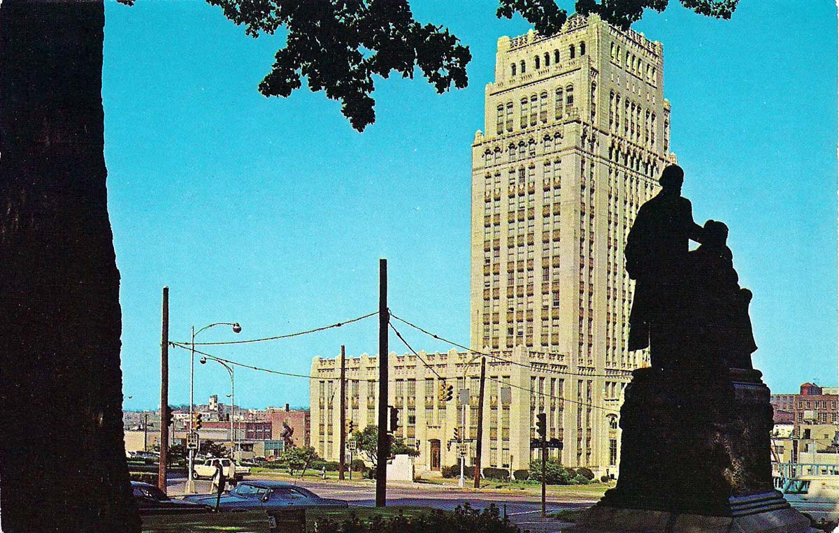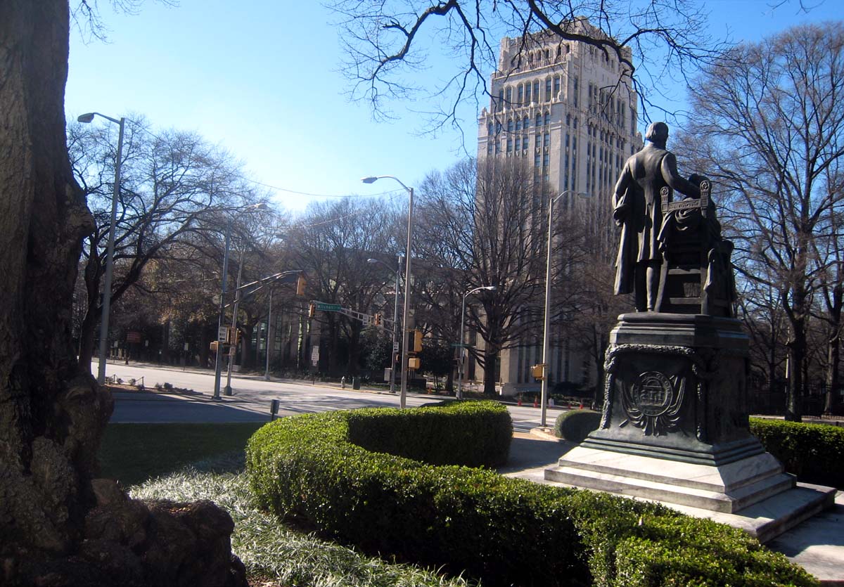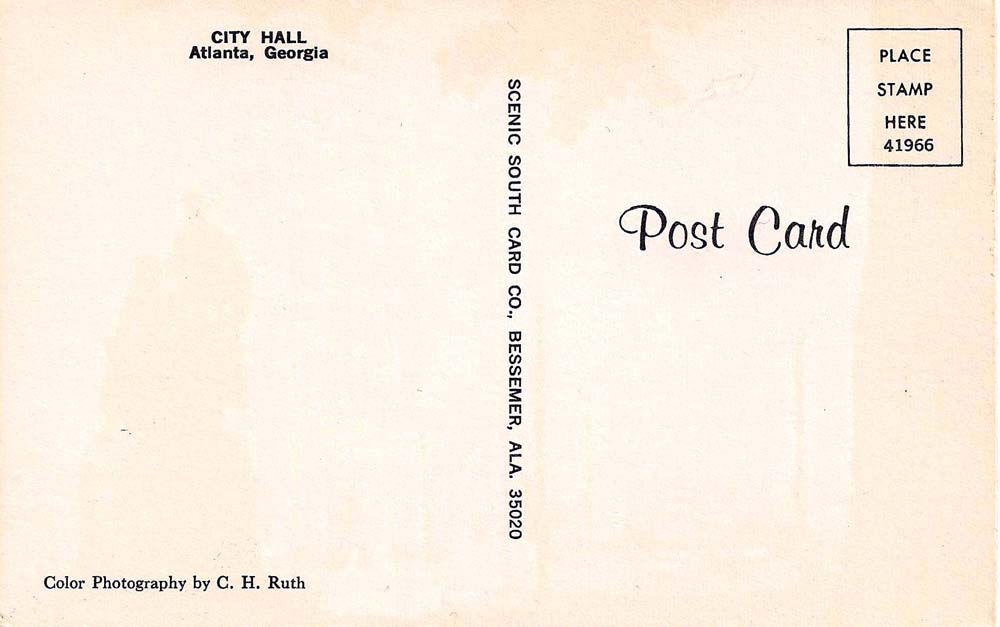 This postcard shows a circa 1970 view of the old City Hall building as seen from the lawn of the State Capitol building. In the foreground is a statue of Joseph E. Brown, the first president of the Atlanta Board Of Education. You can read a little bit more about Brown and see the 1924 school named after him on Peeples Street here. Google map