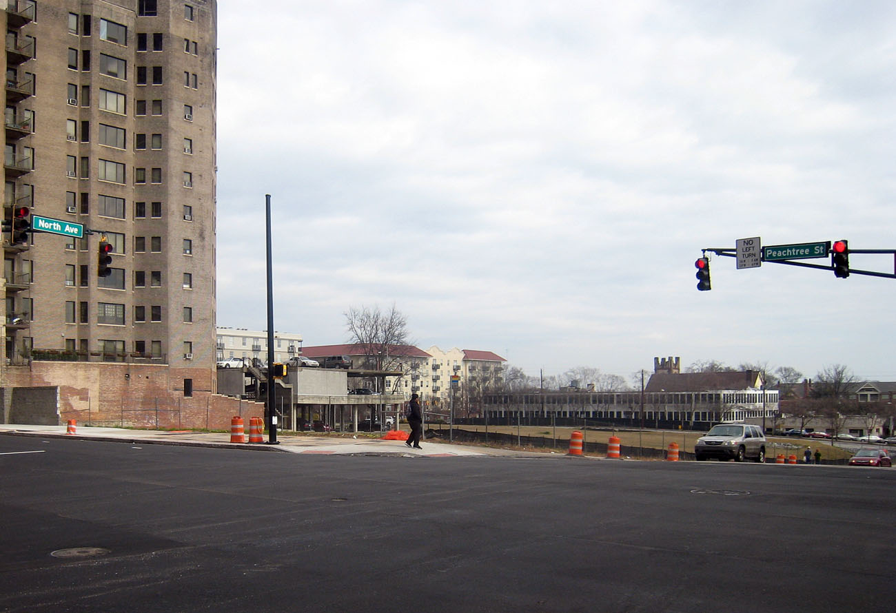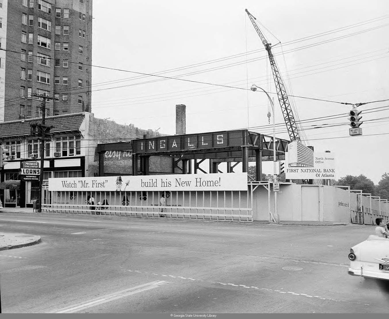 Looking northeast across Peachtree Street toward the construction of the stylishly modern North Avenue branch of the First National Bank in 1959. Another "under construction" shot can be found on the next page. The main office, located a little less than a mile south at Five Points, can be seen on this postcard. In 2006, the beautiful building (not yet completed in this photo) was demolished to make way for two residential condo towers. In March 2013, construction began on the Emory Proton Therapy Center which will occupy this spot. Photo courtesy of the Georgia State University Archives, file #LBCB-055a. Google map