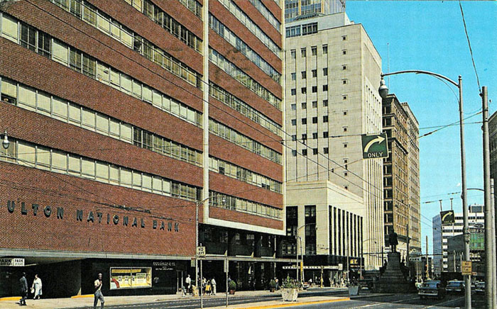 Mid 1960's postcard showing Marietta Street looking eastward, toward Five Points. The red brick building in the foreground is the former Fulton National Bank.