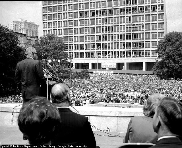 During the 1964 Presidential campaign, Barry Goldwater addresses a crowd at a political rally in Hurt Park. Click here to see a color shot of this event that was published in the Atlanta Journal Constitution Magazine. Date: 09/15/64 Not a Barry Goldwater fan? Here's a photo from the GSU archive that may bring a smile. GSU FILE: LBPE1-043a |