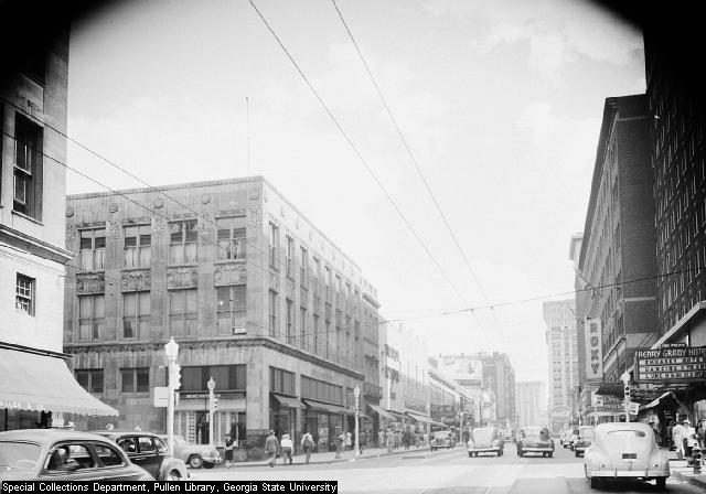 Looking south along Peachtree Street at Peachtree's intersection with Andrew Young International Boulevard, known as Cain Street at the time this photo was taken. The building that now houses Hooters was then Regenstein's, a clothing store. Date: 1946