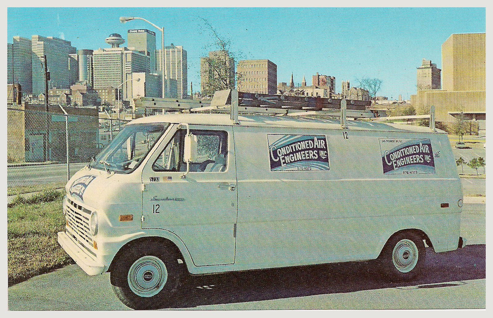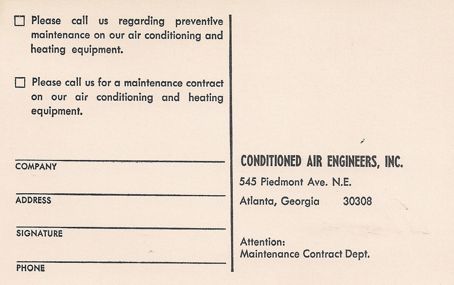 This early 1970s postcard, promoting the Conditioned Air Engineers company, provides us with a wonderful sweeping view of the downtown skyline from a location near the Civic Center. I don't have a precise date for when the photo was taken, but the Coastal States building, visible to the immediate right of the blue-domed Polaris restuarant atop the Hyatt Regency House hotel, was completed in 1971. Also worth pointing out is that St. Joseph's hospital was still standing on Courtland Street, before its 1978 move to a Peachtree-Dunwoody Road location.