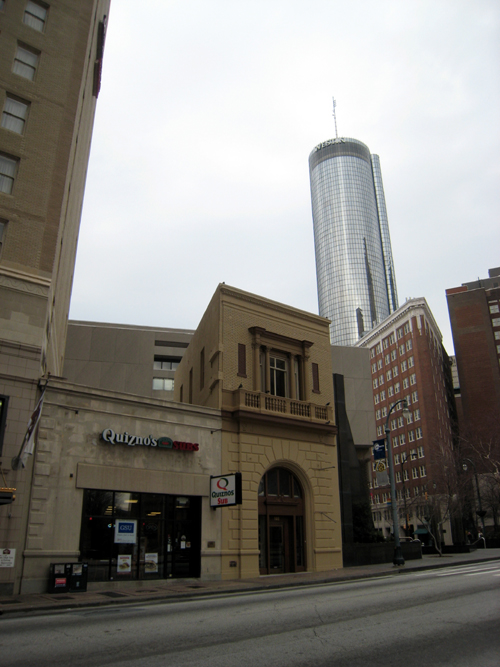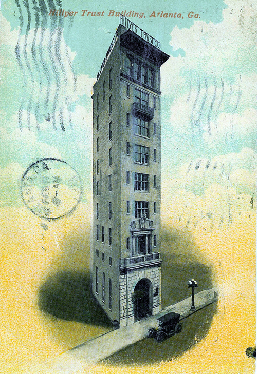 Seen on the left is a postcard (postmarked 1913) of the Hillyer Trust Building at 140 Peachtree Street. Hillyer Trust was one of Atlanta's earliest banking institutions. The Central Atlanta Progress website reports that due to severe damage from weather exposure, "the upper six stories of what was conceivably one of the narrowest highrise office buildings in the United States were razed in 1978." Google map