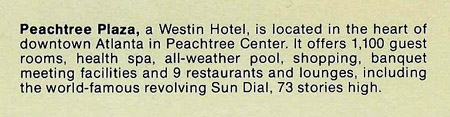 When it opened in 1977, the John Portman-designed Peachtree Plaza hotel was the tallest hotel in the world, a title lost a few months later when Detroit's Renaissance Center (another Portman project) opened.