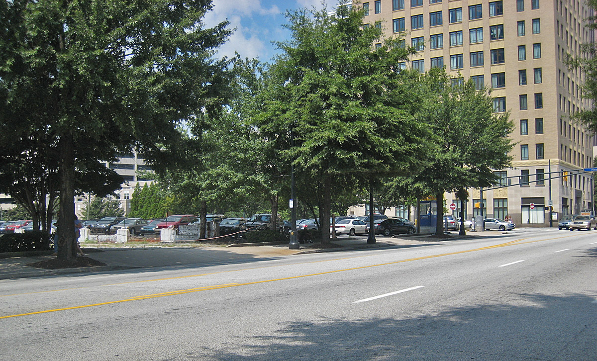 The art deco-influenced Prior Tire service station stood at the southwest corner of Peachtree and Pine Streets, just a few dozen yards away from the front door of the Gypsy Room, a burlesque outpost that operated on Pine Street under several different names over the years. The Prior Tire Company building seen here is long gone, replaced by a parking lot, as seen in the 2013 picture below. If I have my bearings right, the postcard view looks southwest toward the corner of the building, while the updated photo looks to the northwest. Google map