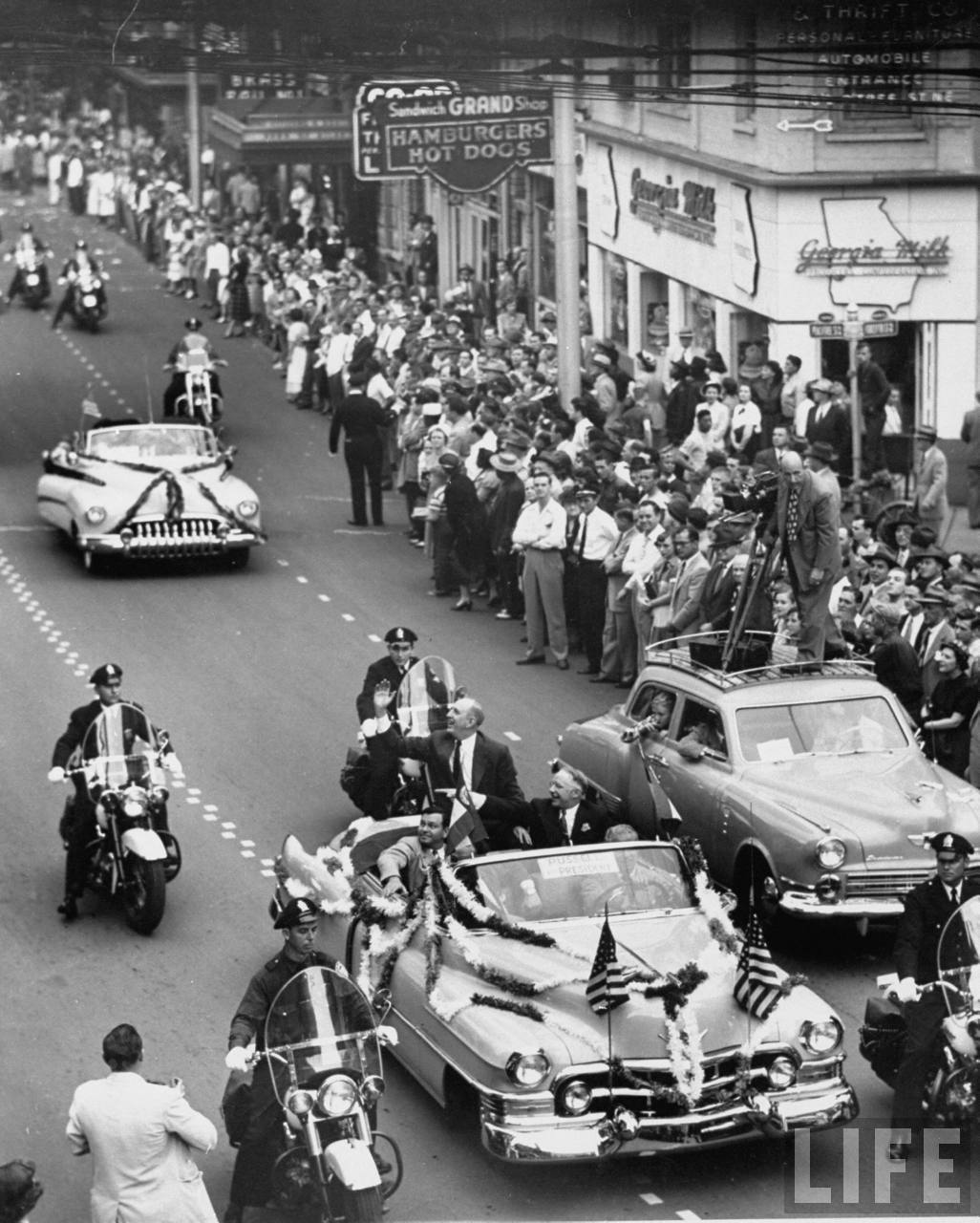 This photo (from the LIFE magazine archives) shows Senator Richard B. Russell at a 1952 event on Peachtree Street. This was during his unsuccessful campaign for President. Russell, a Democrat, came in behind Senator Estes Kefauver of Tennessee and Governor Adlai Stevenson of Illinois. In the eventual election, Stevenson lost to Republican Dwight Eisenhower.