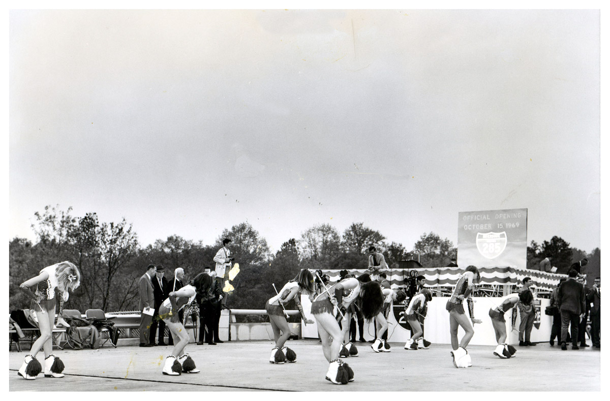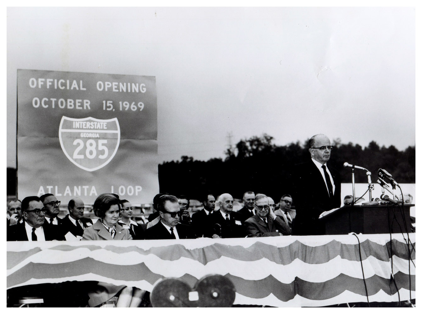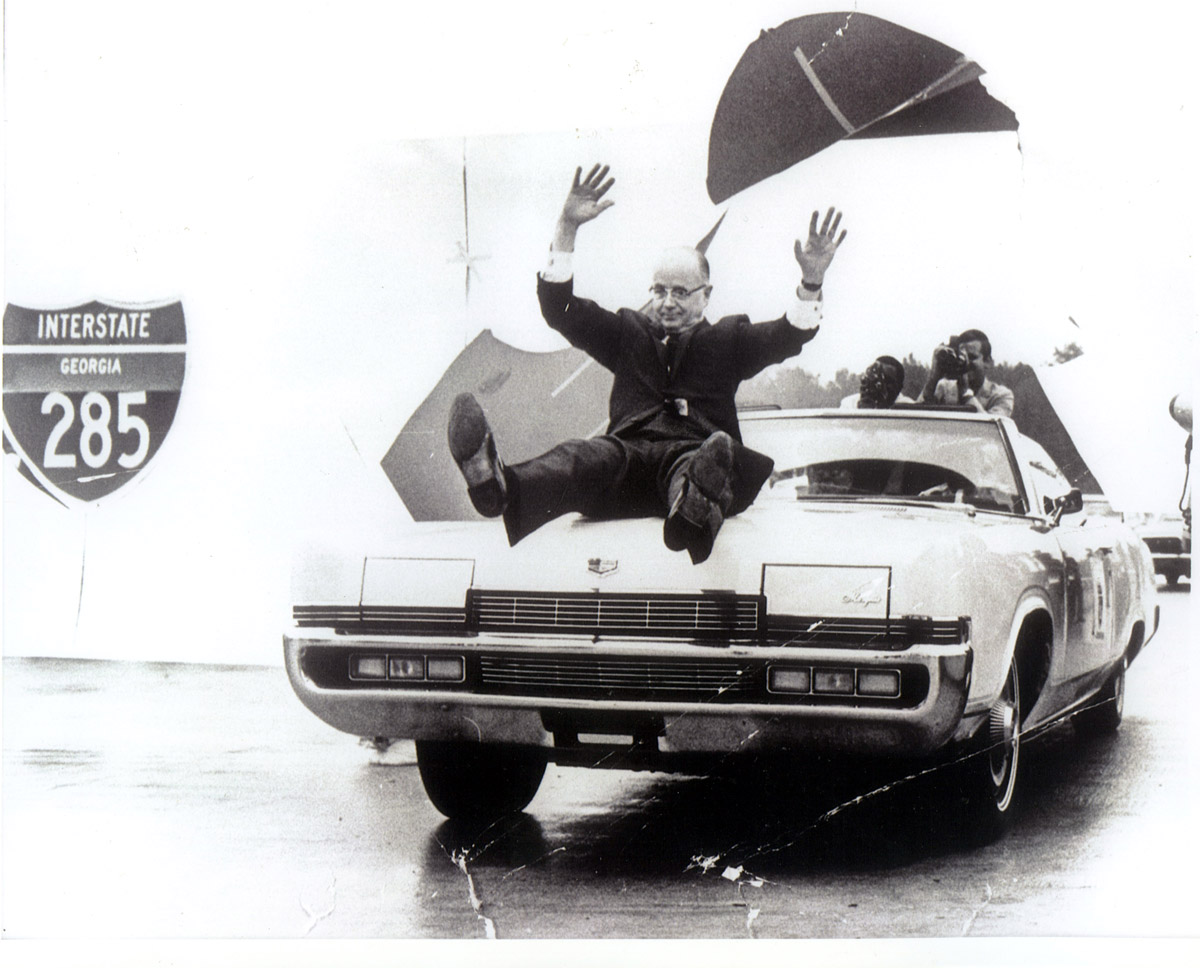 Interstate 285, the perimeter highway that circles Atlanta, was officially opened to considerable fanfare on October 15, 1969. Governor Lester Maddox presided over the gala affair and was photographed after hopping onto the hood of a car that was driven through a paper barrier to commemorate the big event. Scroll down to see the picture.