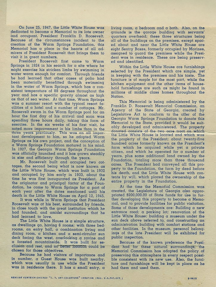 The background information concerning FDR's Little White House was tucked inside a souvenir postcard folder that provided a tour of the house.