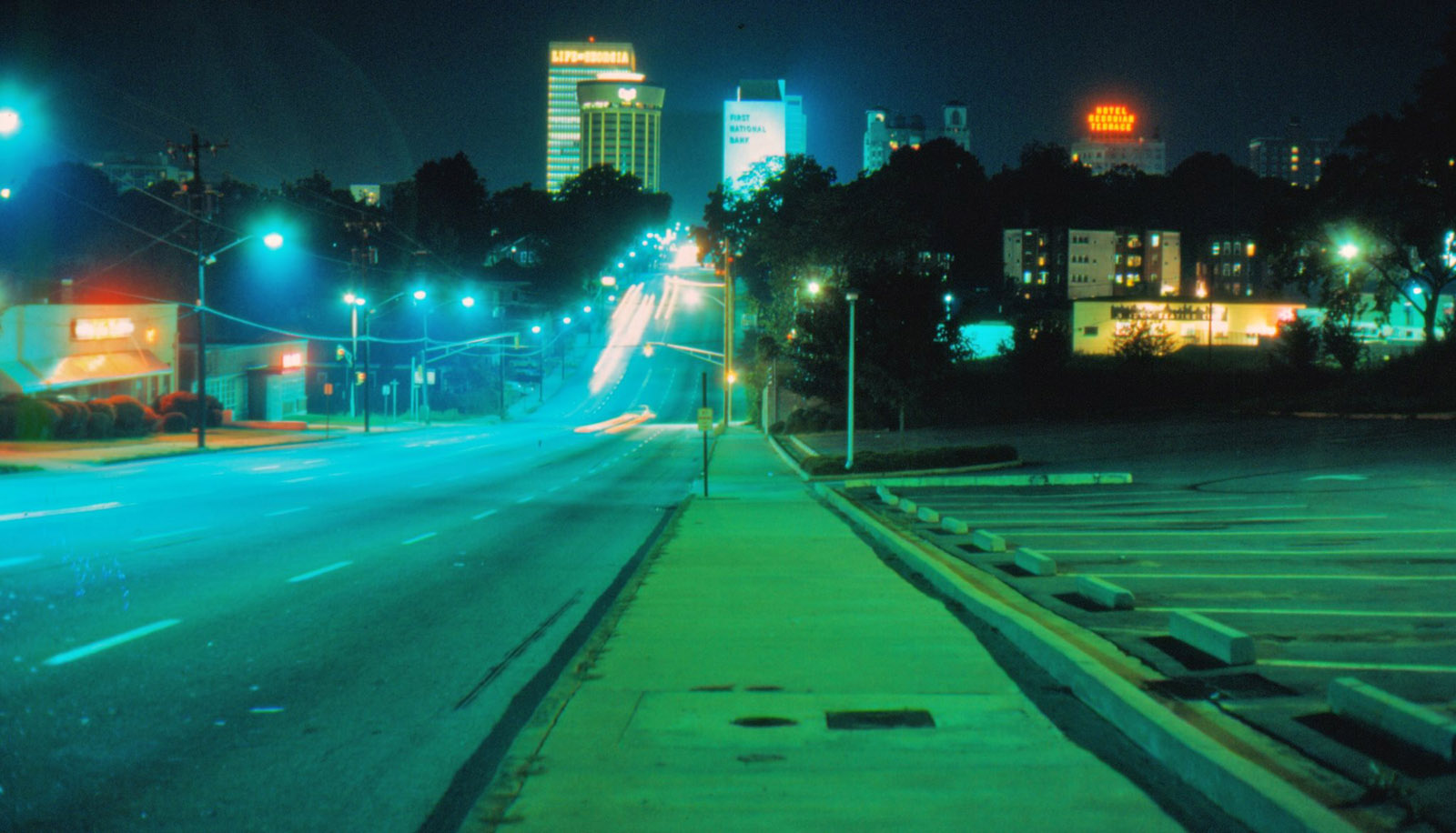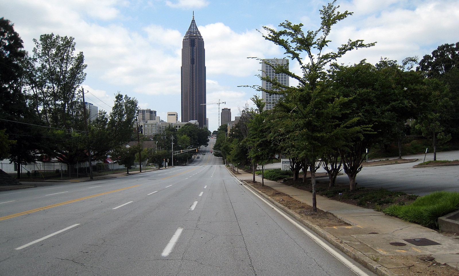 Here's an excellent photo by Dr. William A. Wood (appearing here courtesy of Andrew P. Wood) that looks west along North Avenue toward Peachtree Street, which is at the top of the hill in the distance. My photo, below, doesn't replicate the original with a great degree of precision, but you get the idea. The circular C&S Bank tower (1967 - 1993) and the First National Bank (1960 - 2006) buildings are long gone and the new-ish colossal building looming over everything is the Bank of America Plaza, completed in 1992. Google map