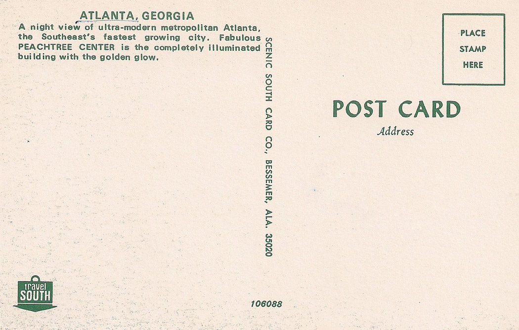 This circa 1968 postcard shows a nighttime view of the Atlanta skyline, as seen from the east side of downtown. It looks to me like the photo may have been taken from (or near) the roof of Georgia Baptist Hospital (now known as the Atlanta Medical Center) on Boulevard.