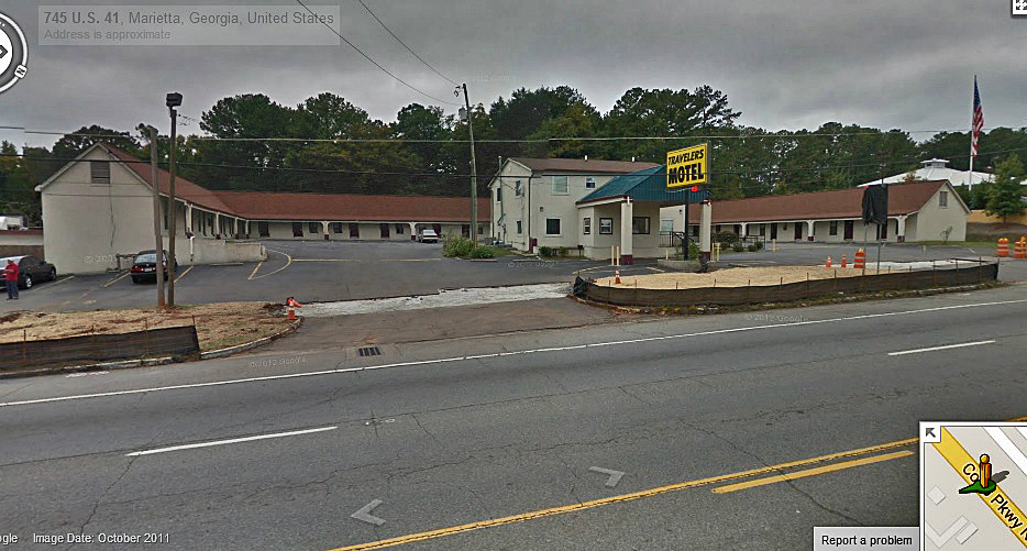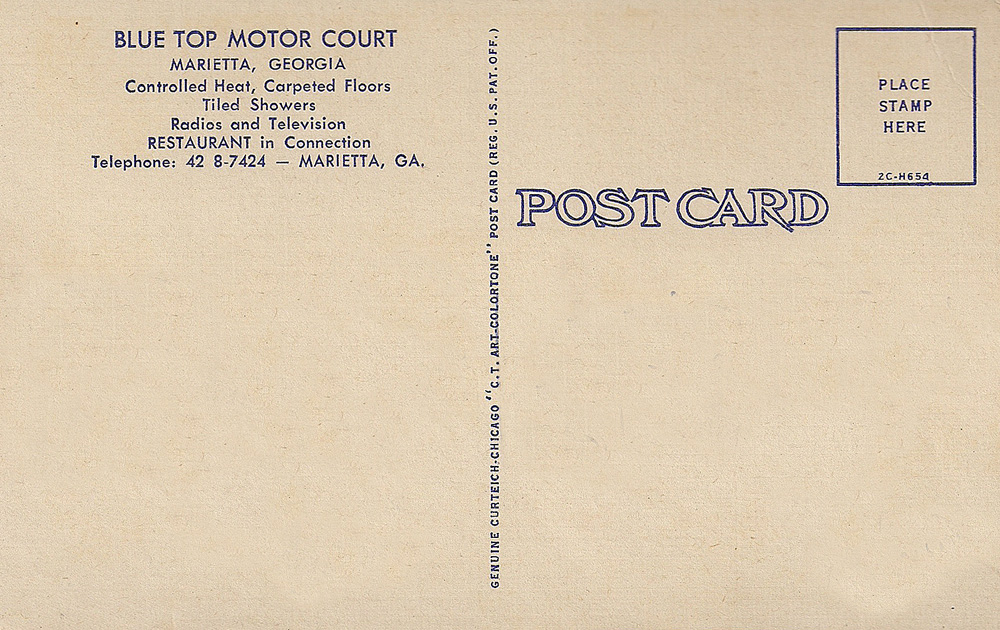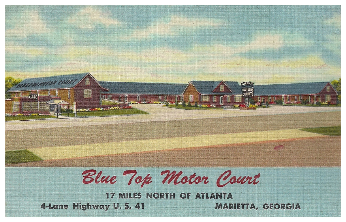 Located 17 miles north of Atlanta on US 41, the (former) Blue Top Motor Court still stands. Not only that it's still in business as a motel, known these days as the Travelers Motel. Google map