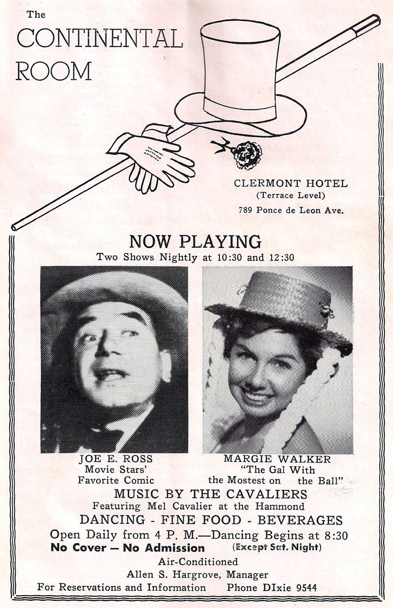 The Continental Room filled the gap left by The Gypsy Room. Joe E. Ross, , seen on the left in the TV Guide cover shot below, soon to be notable for his 1955 film Teasearama, appeared there in June of 1954. In 1961, he would emerge as a national sitcom star when he appeared as Officer Gunther Toody in Car 54, Where Are You? In 1966, he starred as a Gronk, a pre-historic caveman who manages to take a time travel trip (with his wife, played by Imogene Coca) to contemporary Los Angeles. By the early 1970's, Ross was heard by countless kids each week as he lent his voice talents to Saturday morning animation shows like Help! It's The Hair Bear Bunch, Hong Kong Phooey, and The New Tom & Jerry Show.