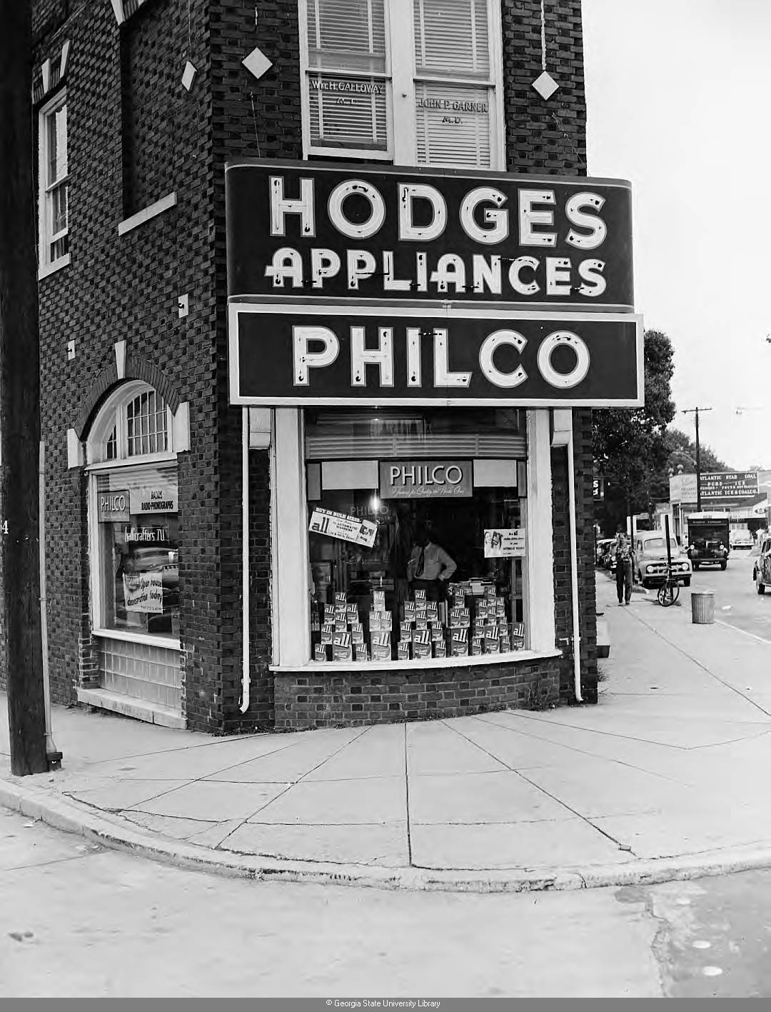 In the heart of East Atlanta, in 1952 Hodges Appliances was doing business in the wedge-shaped building that has been home to the Flatiron Bar since 1997. Photo courtesy of the Georgia State University Library Archives, file #LBCB068-001a. Google map