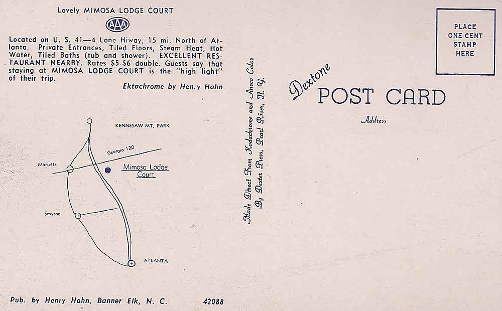 The Mimosa Lodge Court was a motel situated alongside US 41 fifteen miles north of Atlanta, according to the back of the postcard, so this was located in the Marietta vicinity, even though it may or may not have been nestled within the city limits. One nice feature of the card is the handy map found on the back which specifies the site of the motel, on the east side of 41 and just a bit south of Ga. Highway 120.