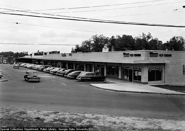 Shopping center at the intersection of North Decatur Rd and Clairmont Road. Date: 1953