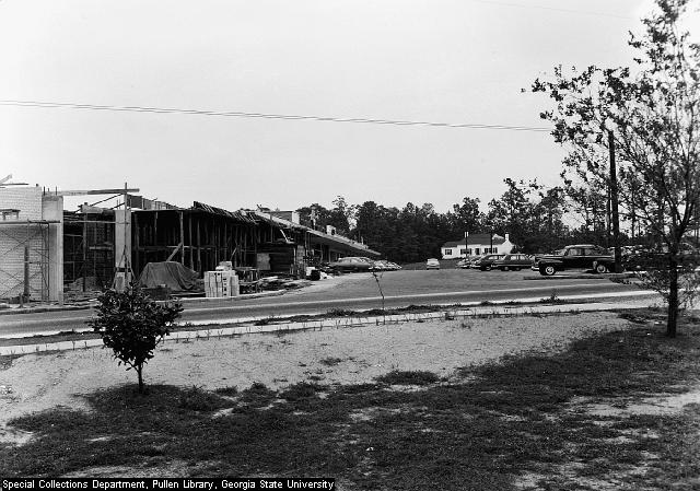 Shopping center under construction at the corner of North Decatur Rd and Clairmont Road. This view looks across Clairmont from near the rear of what is now a Kinko's copy store. Date: 1952