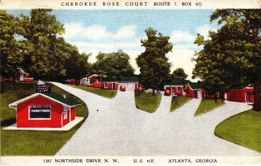 This undated postcard shows the Cherokee Rose Court motel at 1387 Northside Drive, which is also US 41. In the days before Interstate 75 was built, Highway 41 served as the main north/south roadway through town and many roadside motels were located along the route. As you can see in the image below (courtesy of Google Maps), a storage facility now occupies this site. Google map