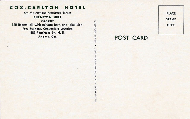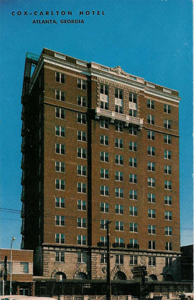 Undated postcard of the Cox-Carlton Hotel at 683 Peachtree Street NE. Google map