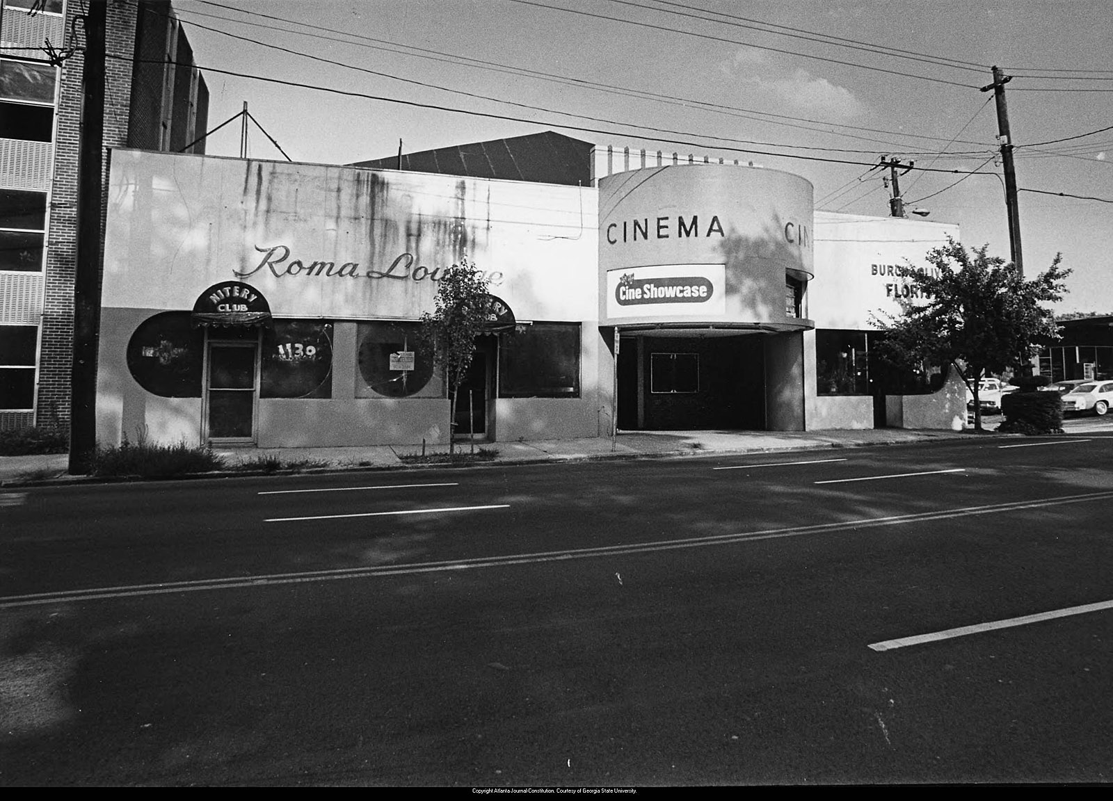 This 1981 photo shows the NE corner of Peachtree Street and 13th Street, at the time the site of the Roma Lounge and the Cine Showcase movie theater. In previous decades the theater on the corner was known as the Peachtree Art theater and Margaret Mitchell, author of a famous book about the Civil War if I'm not mistaken, was on her way to this movie house in 1949 when she was struck by an automobile. Photo courtesy of the Ga. State University Library Archives, file #AJCP136-009a. Google map