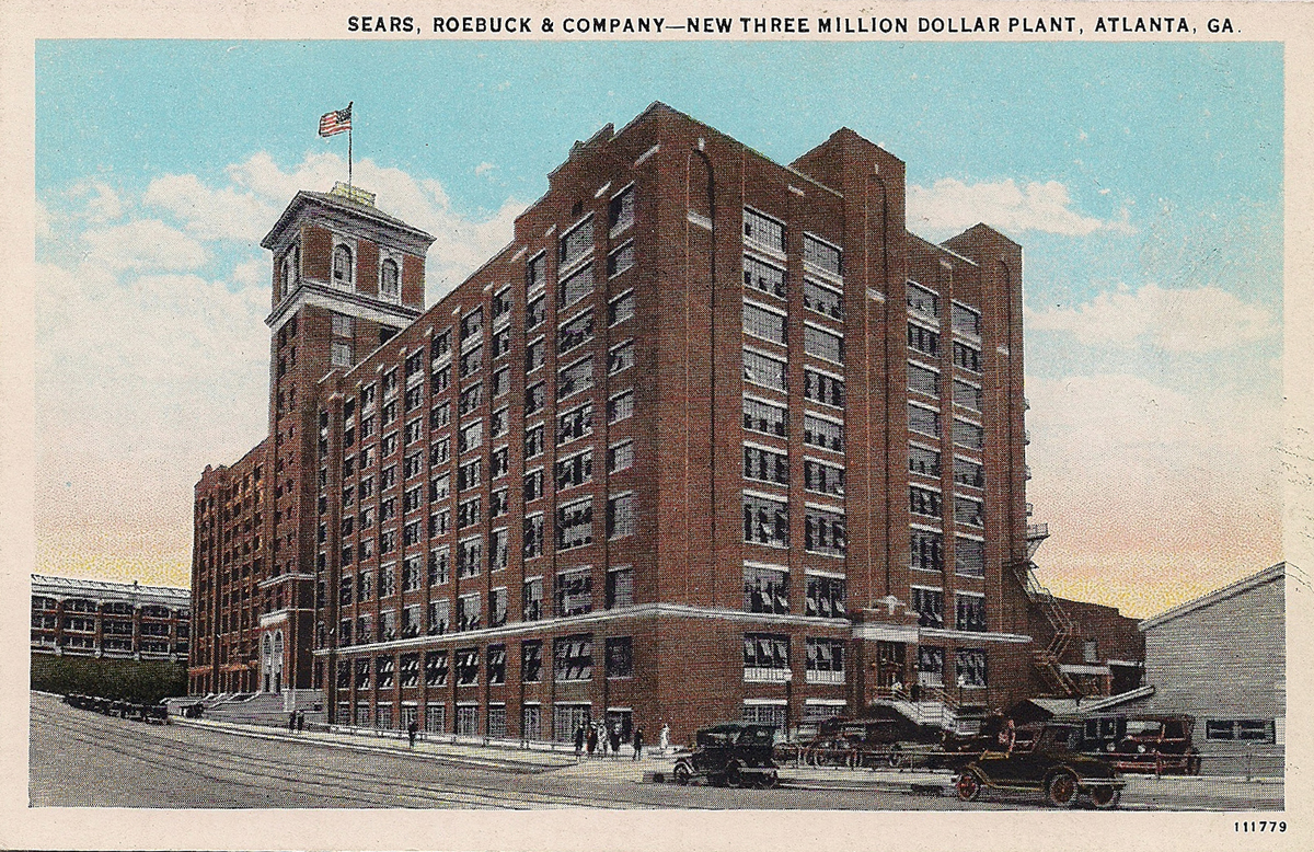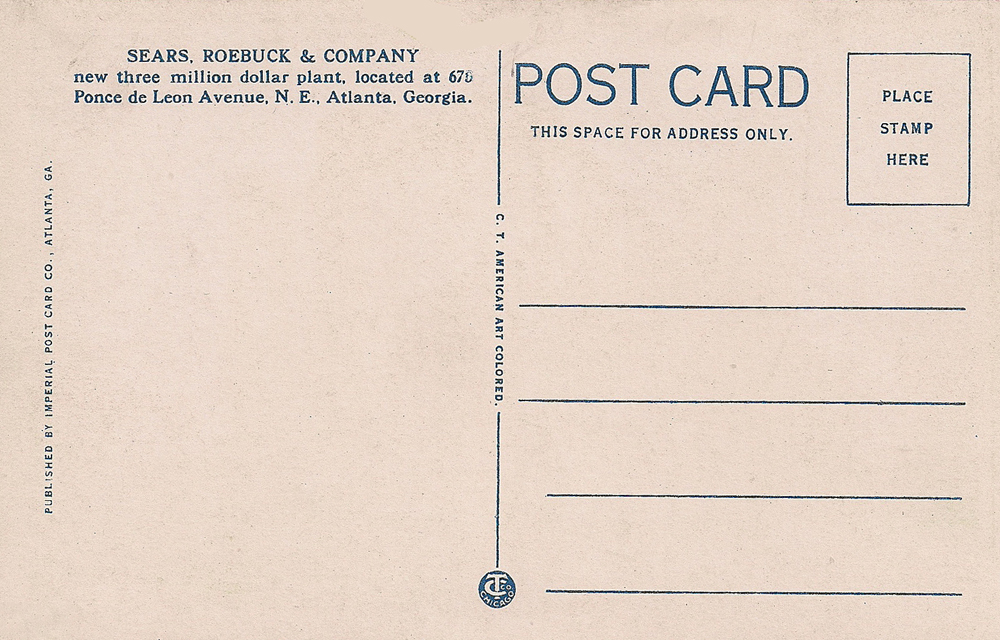 This undated postcard shows the Sears building at 675 Ponce de Leon Avenue. It opened in 1926 and served for many years as both a warehouse and a retail store. The store closed in 1979 and I think it was used for a while after that as warehouse space before housing Atlanta City Hall offices throughout much of the 1990s. Currently, the building is known as Ponce City Market and is nearing the end of a massive redevelopment that will result in apartments, restaurants and retail space. Lower photo, December, 2013. Google map
