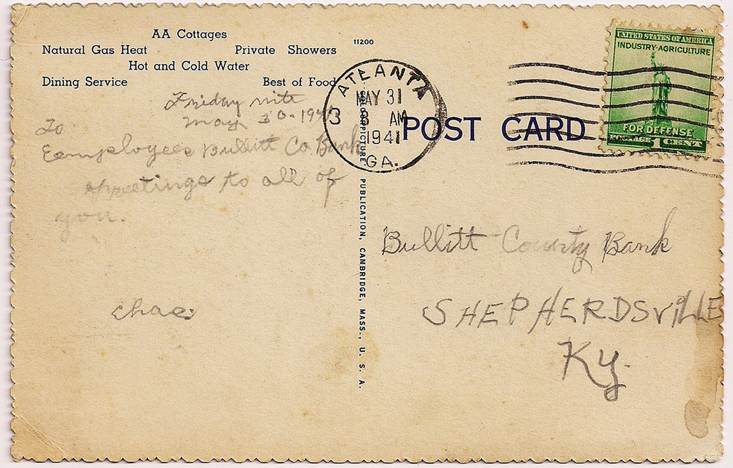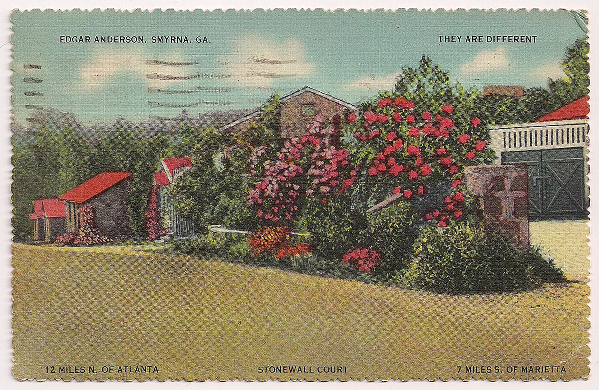 Stonewall Court in Smyrna was a small roadside motel operation that offered travelers not only a place to sleep and enjoy a meal, but also a chance to peruse some museum-quality historical artifacts as well. The operation suffered a major fire in June 1946, as reported on the Smyrna Historical & Genealogical Society's website: "Stonewall Court dining room, noted for its fried chicken and fine museum collection, burned to the ground Monday afternoon. Antique weapons, firearms of 1860 vintage, Confederate uniforms and flags, and other relics were destroyed. Edgar Anderson, owner, placed the loss at $100,000. The building and its equipment represent a $35,00 loss." The second postcard seen below seems to show some of the historical items on display in the dining room.