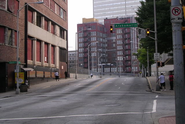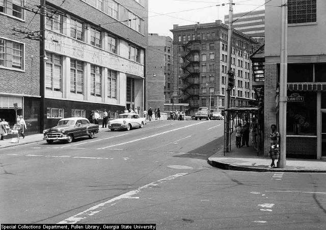 Forsyth Street at Alabama Street looking north. The structure on the left is the Atlanta Constitution Building, completed in 1947 and now facing possible destruction. More information can be found here. Date: 06/09/56