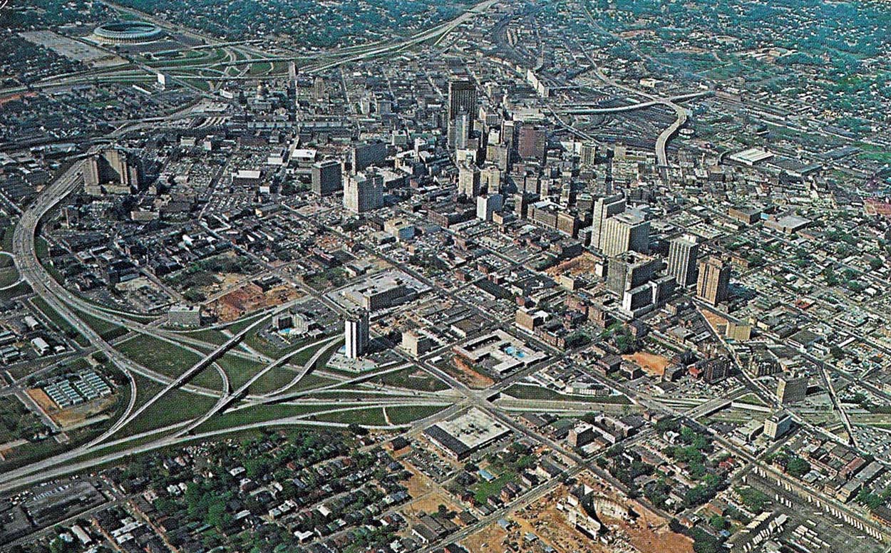 Date: Probably the summer of 1966. Fulton County Stadium (upper left corner) officially opened in the spring of 1965, so the picture seems to have been taken after that date. Both the Hyatt Regency and the Atlanta Civic Center were completed in 1967 and a close examination shows that both these projects were underway, but not yet completed, when this photo was taken. Thanks to reader Jon S. for pointing out to me a few things that laziness prevented me from discovering on my own!