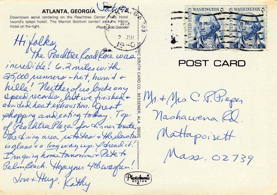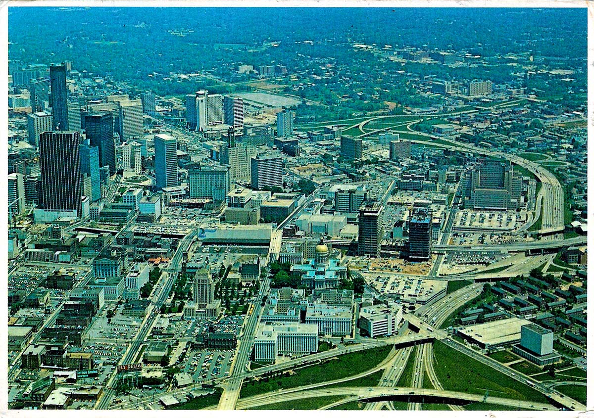 This aerial postcard depicts downtown as it appeared around 1980.  The James H. "Sloppy" Floyd office towers (adjacent to the gold dome of the state capitol) are clearly still under construction.  The towers, which house state government offices, opened in 1981.   Floyd served in the Georgia House Of Representatives from 1953 to 1974.    Thumbnails of many more aerial view postcards can be found here.