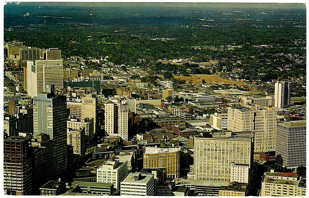 This aerial postcard shows downtown Atlanta in about 1965. In the lower left corner, we see that the First National Bank building, which is now known as the Wachovia Bank of Georgia building, a project completed in 1966, was still under construction. Also, in the distance we can see that the ground has been cleared for the Atlanta Civic Center, a project that was completed in 1968. Thumbnails of many more aerial view postcards can be found here.