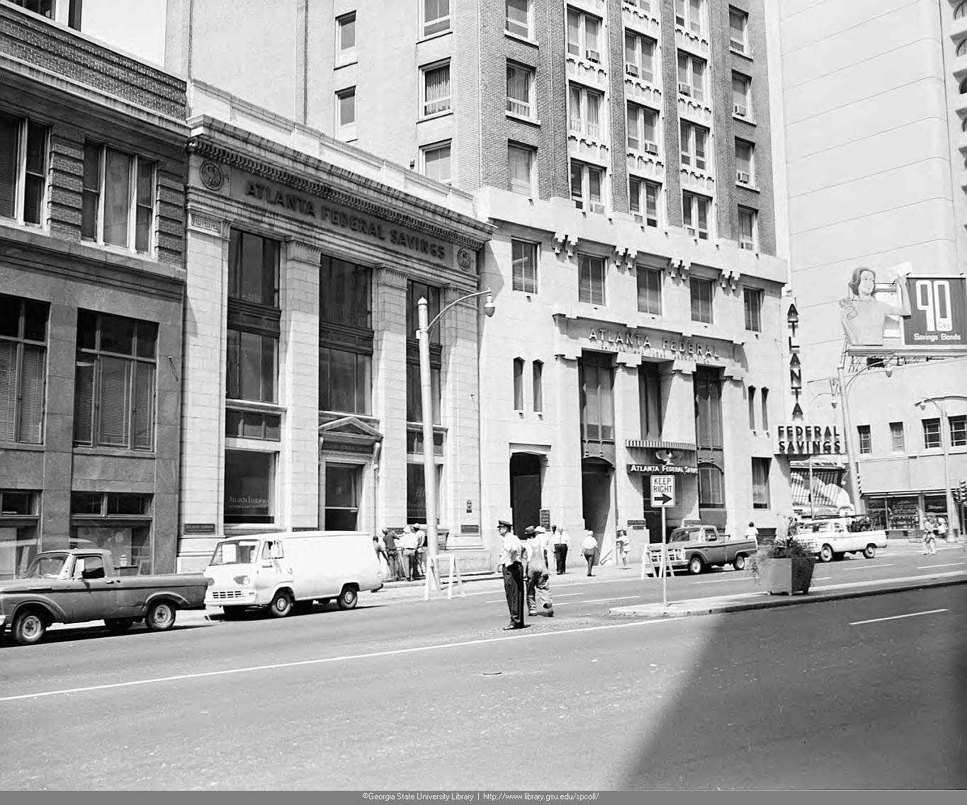 The former Atlanta Federal Savings & Loan building at the corner of Marietta and Broad Streets was known as the Third National Bank in 1911 when this building opened. At some point, its facade was sheathed in aluminum to give it an updated appearance that hasn't aged very well. These days, it's an apartment/condo complex known as The Metropolitan. This 1966 photo appears here courtesy of the Georgia State University Library, file #N36-176_b. Lower photo: February, 2013. Google map