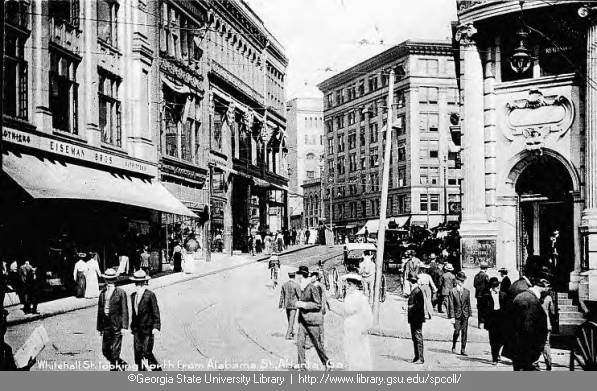 Below: a reproduction of an undated postcard showing the view looking north along Whitehall Street (later renamed Peachtree Street SW) toward Five Points. On the right is the Atlanta National Bank building.