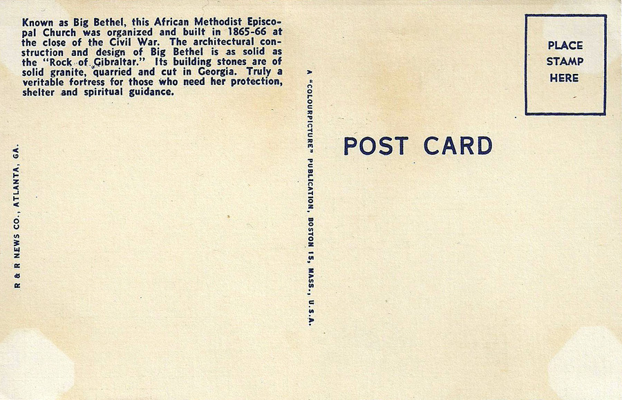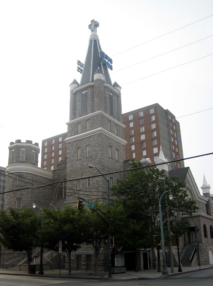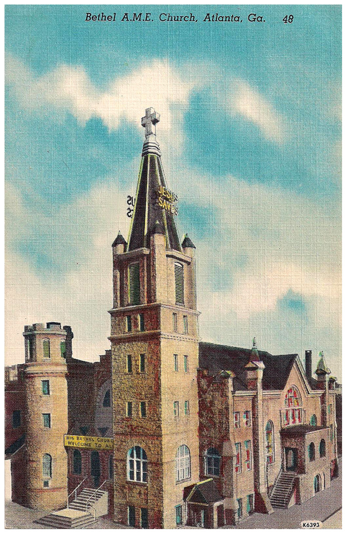 The Big Bethel A.M.E. church at 220 Auburn Avenue NE has been an Atlanta landmark for decades. Perhaps its most observed feature is the "Jesus Saves" sign atop its steeple, a sight easily visible from the Downtown Connector, where many thousands of motorists stream by daily. According to the church's website, Big Bethel's basement was the original site of the Gate City Colored School, the first public school in Atlanta for African Americans, which opened in 1879. Though the church got its start in 1847, this building was not constructed until 1891. The interior was completely remodeled following a fire in 1921, but the walls, all except for the western one, all date back to 1891. Google map