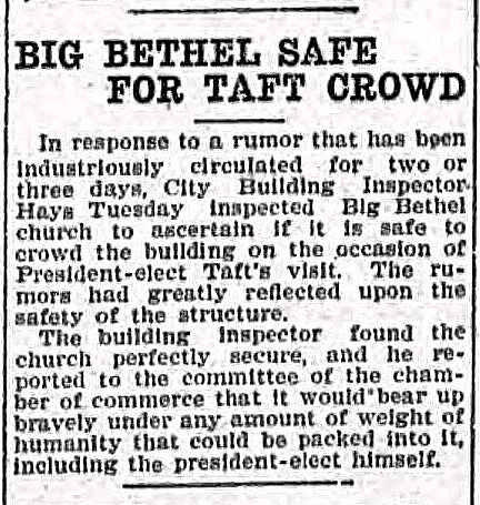 Above: 01/06/09 - The Atlanta Georgian And News reports on the fact that Atlanta's City Building Inspector had given the church a thorough inspection and determined it was structurally sound enough to accommodate the large crowds that would gather soon at Big Bethel to here President-elect Taft speak on Saturday, January 16, 1909.