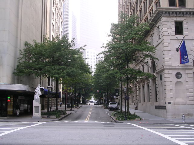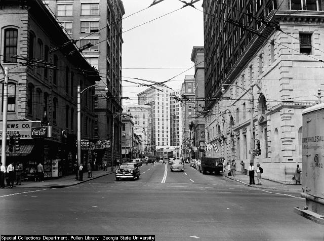 Broad Street at Marietta Street, one block west of Five Points. On the right is the building that served as the headquarters for Citizens & Southern Bank, which, through the magic of mergers became known as Nationsbank in the 1990's. See a 1910 postcard of this view. Date: 09/27/55 GSU FILE: LBGPNS13-142a |