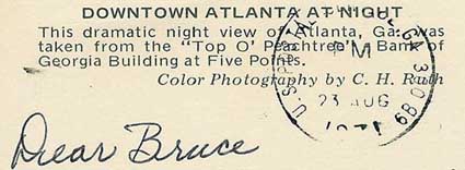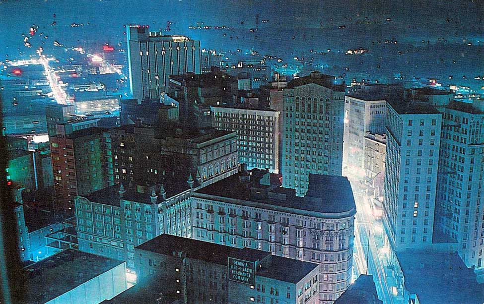 Postcard photo looking north at downtown from the top of the Bank of Georgia Building at Five Points.