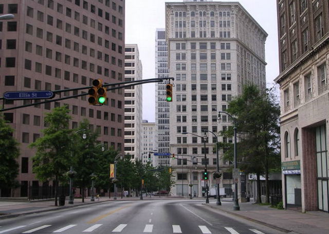 Peachtree Street looking south from the intersection of Peachtree and Ellis Street. The big white building is the Candler Building and on the right is the Hotel Winecoff. More Winecoff information can be found over here. Date: 1943