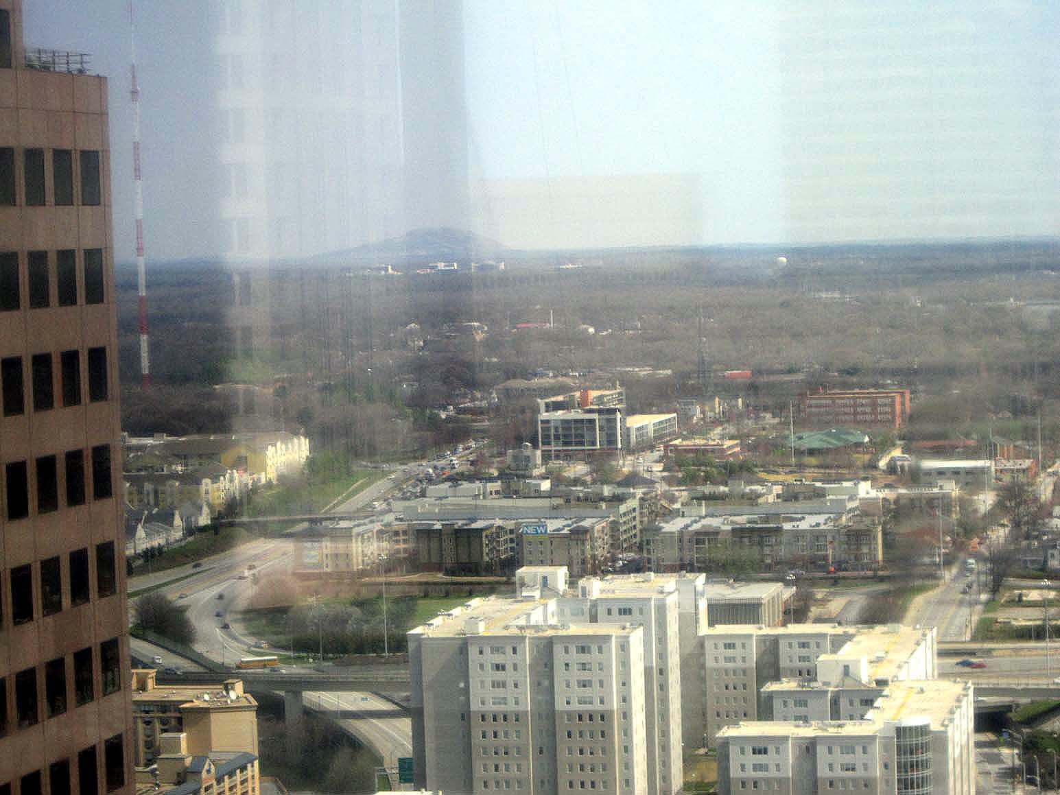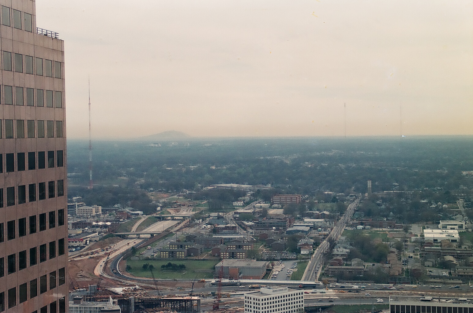 Here's another contribution from reader Roger O'Kelley. This photo, taken in April, 1984 shows the view looking east from the roof of the Equitable Building. Initially I didn't notice something that I find pretty amazing; there used to be a Boulevard bridge over Freedom Parkway. It's the second bridge in the photo below. Now it's a standard 4-way intersection.