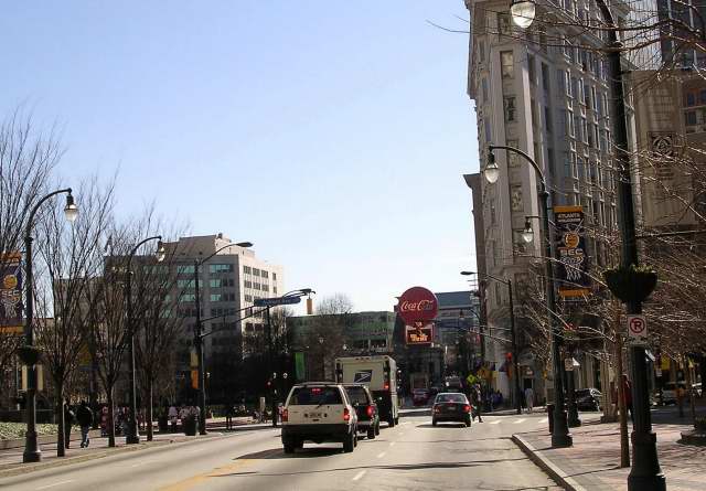 Peachtree Street looking south toward the Flatiron Bldg on the right and Woodruff Park on the left. This photo is an excellent illustration of the dramatic changes that downtown Atlanta has undergone in recent decades. Date: 03/12/04 |