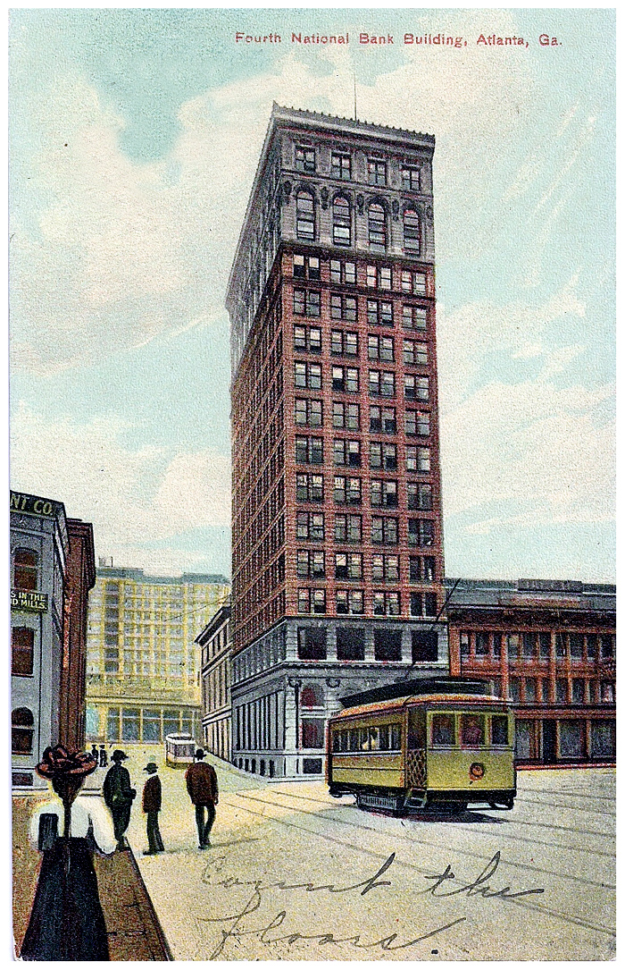 This postcard, from 1910 or so I think, shows the Fourth National Bank building at 14 Peachtree Street, the southwest corner of Five Points.