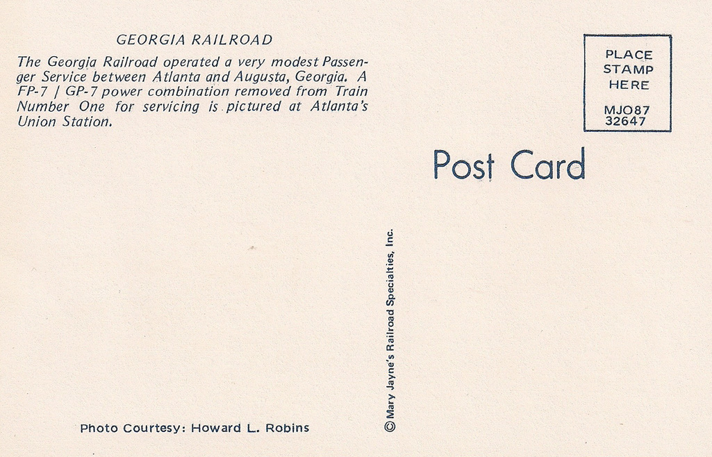 The Georgia Railroad train seen on this postcard was parked at Union Station if the text (see below) on the back of the card has it right, though Union Station is not one of the buildings seen in the background. If I have my bearings right, and I'm pretty sure I probably don't, I think perhaps the station itself is out of camera range on the left. In any event, you can see Union Station if you click the NEXT button in the corner.