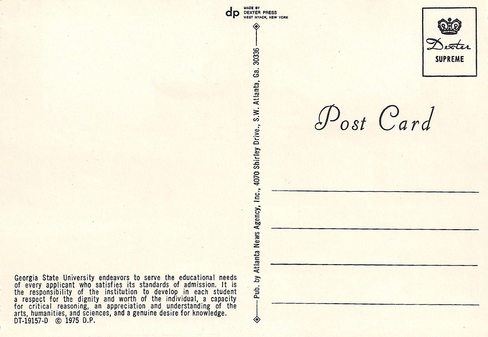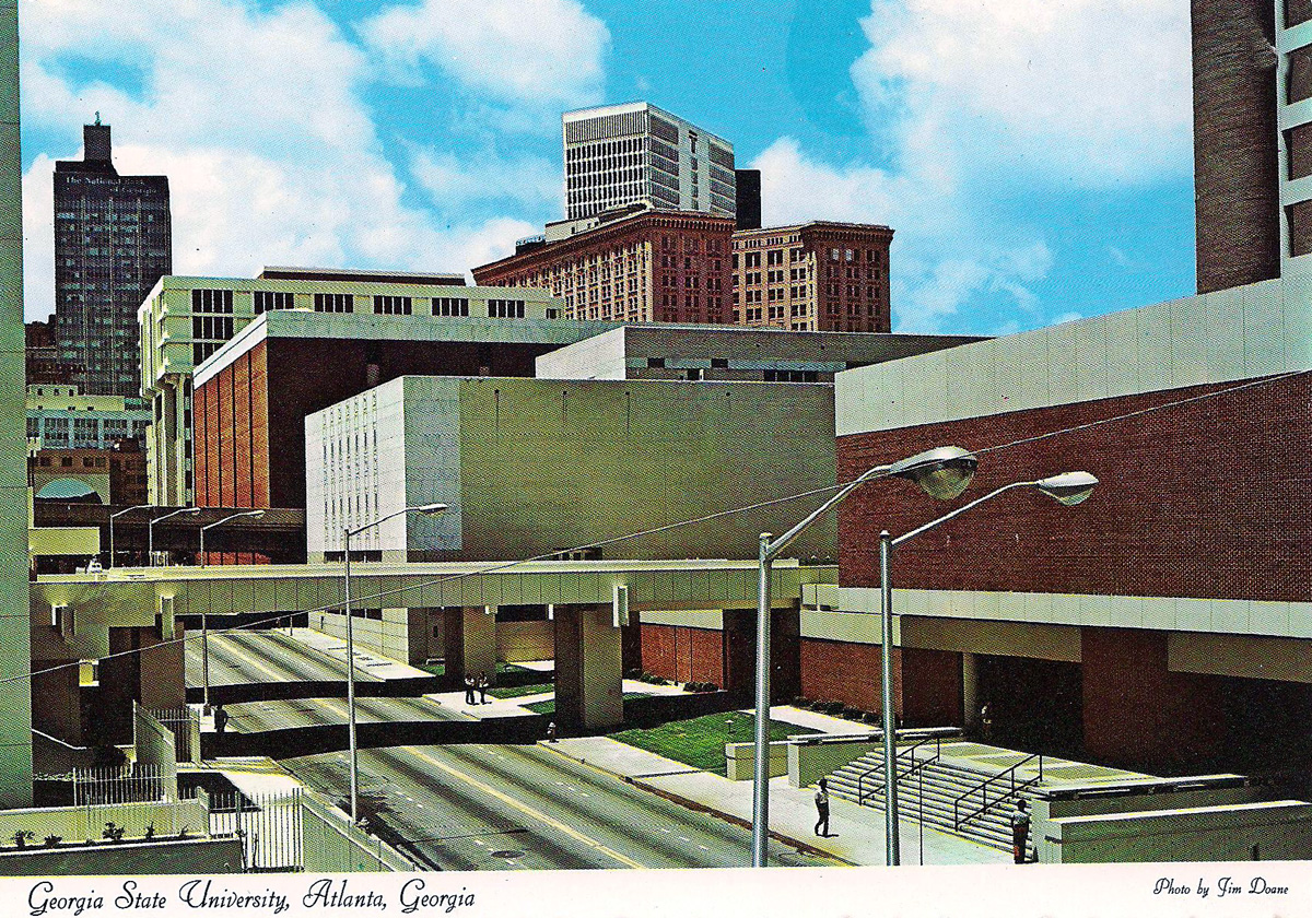 This 1975 postcard shows the view looking west along Decatur Street toward the heart of the Georgia State University campus, which has expanded considerably over the last few decades, moving into many buildings that would likely otherwise be empty.