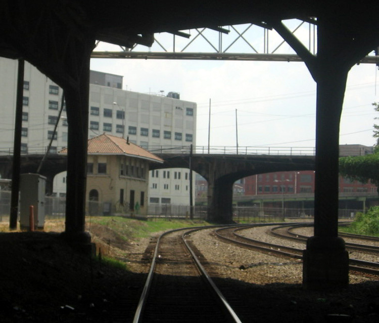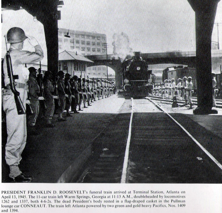 Downtown railroad gulch underneath Mitchell Street. This view looks to the south toward the Nelson Street bridge. The train in the photo is taking President Franklin Roosevelt's body from Warm Springs, Georgia to Washington, D.C. Thanks to reader Jeff for the photos. Date: 04/13/45