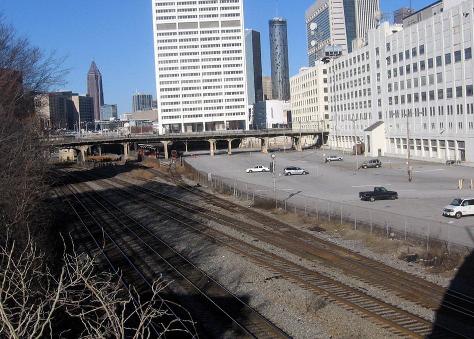 Jeff Morrison: View from Peters St. bridge toward the Mitchell St. bridge and the Terminal Station site. The three long buildings along Spring St. were offices for the Southern Railway (later Norfolk Southern).
