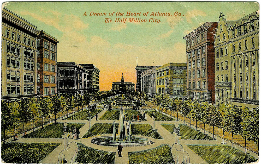 This postcard depicts an artist's rendering of a possible sweeping redesign of the streetscape in front on the Georgia State Capitol building. The "half million" population figure touted here corresponds with metro Atlanta population figures from 1910, when the area had a population of 522,422. Atlanta's official population in 1910 was a little over 154,000 but that figure reflects only the number of people residing within the city limits, which were much smaller then. In 1952, the city of Atlanta annexed an additional 82 square miles and in doing so added 100,000 residents overnight.