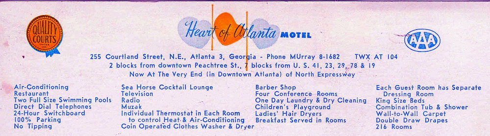 The Heart of Atlanta motel, located at 255 Courtland Street NE, was owned by Atlanta attorney Moreton Rolleston Jr. Rolleston, a committed segregationist, refused to rent rooms at his hotel to black customers. Upon passage of the Civil Rights Act of 1964, Rolleston immediately filed suit in federal court to assert that the law was the result of an overly broad interpretation of the U.S. Constitution's commerce clause. Rolleston represented himself in the case, HEART OF ATLANTA MOTEL, INC. v. UNITED STATES ET AL., which went all the way to the United States Supreme Court. Rolleston lost when the Supreme Court ruled that Congress was well within its powers to regulate interstate commerce in such a manner. The Hilton Hotel now stands on the former site of the Heart of Atlanta Motel.