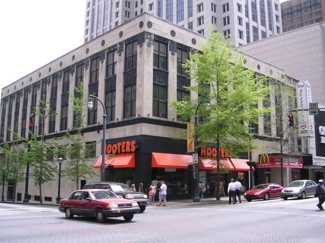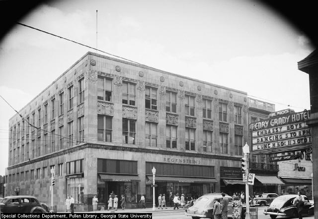 Regenstein's was a clothing store at the corner of Peachtree Street and Cain Street. Visible on the right side of this photo is the sign for the Henry Grady Hotel. The Peachtree Westin Hotel now stands on that location. Date: 05/03/46