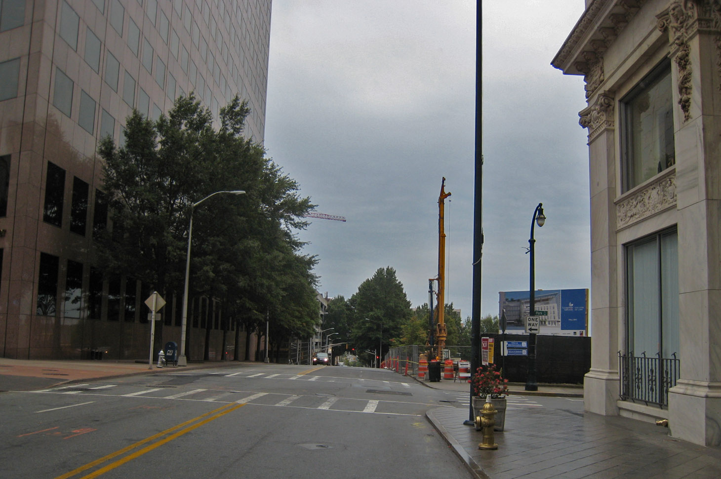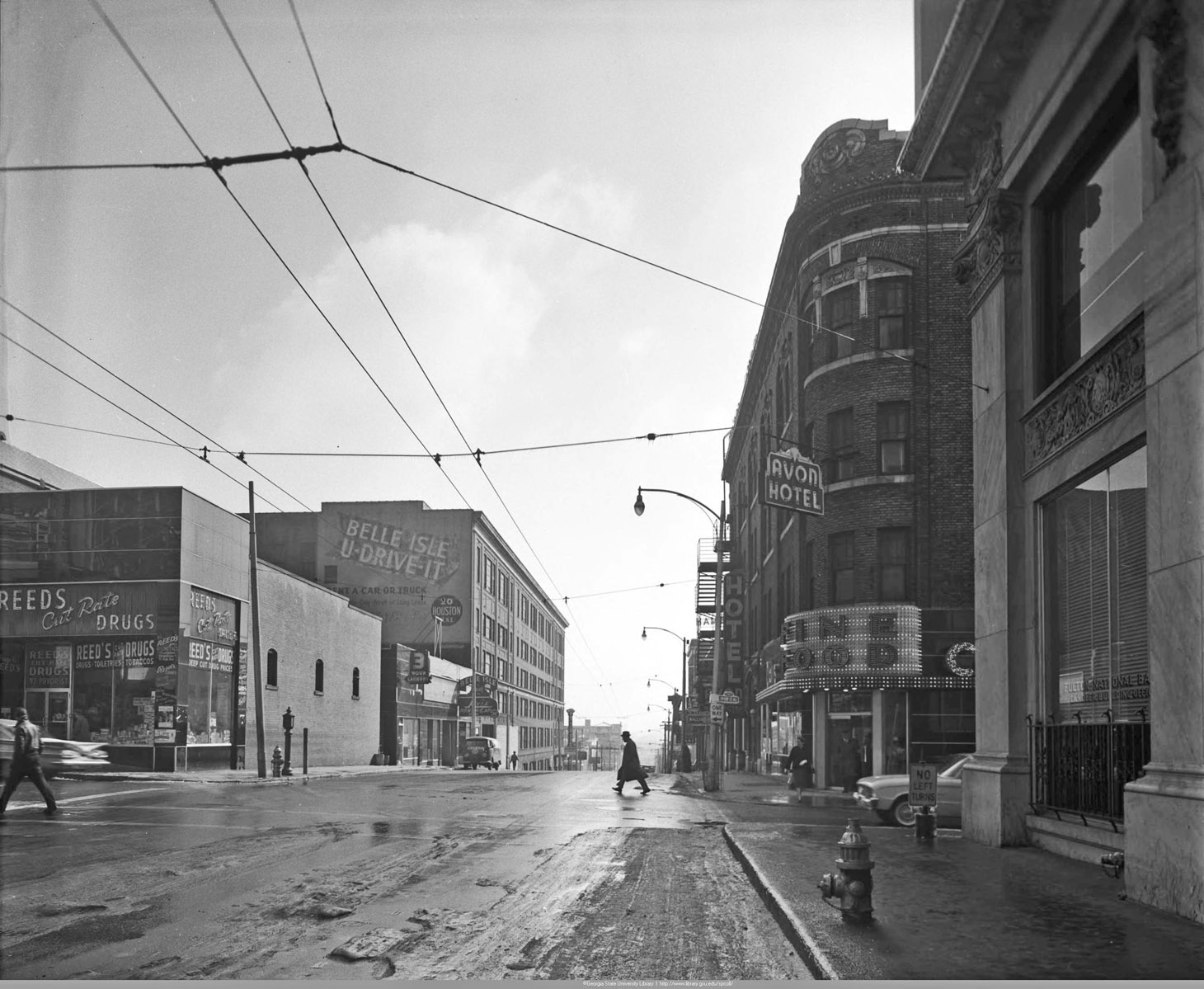 1960 - This photo looks to the NE along Houston Street toward Houston's intersection with Pryor Street. In recent decades, Houston Street was renamed John Wesley Dobbs Avenue and this portion of Pryor Street has been rechristened as Park Place. The Avon Hotel visible on the right was still standing in the late 1970s, but following its demolition the spot has served as a parking lot. Construction is now underway to build Georgia State University's new law school there. Plans call for it to open in the fall of 2015. Photo courtesy of Georgia State University, file #N08-006_c. Google map