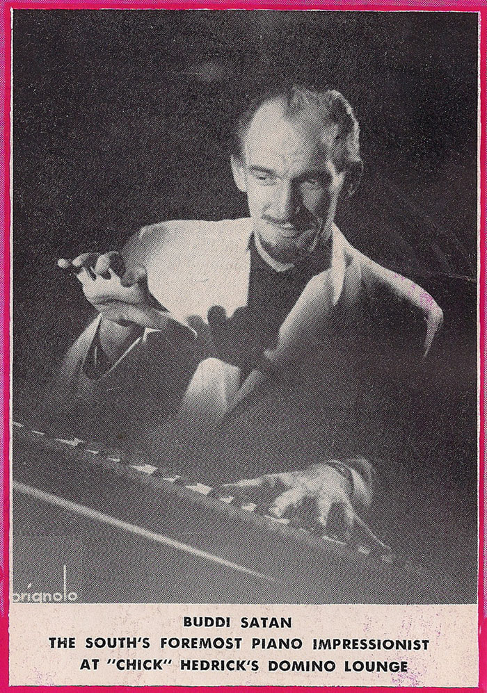What I want to know is, how did a guy with the stage name Buddi Satan ever make a living playing nightclubs in the deep south in the early 1950's. Perhaps religious fundamentalists weren't controlling things as tightly as one would imagine. In any case, you really should scroll down to see the close-up of Buddi Satan's truly bizarre promotional photo.