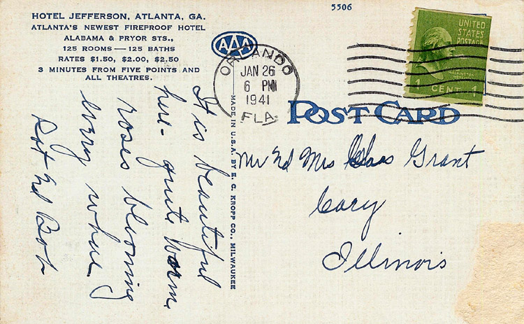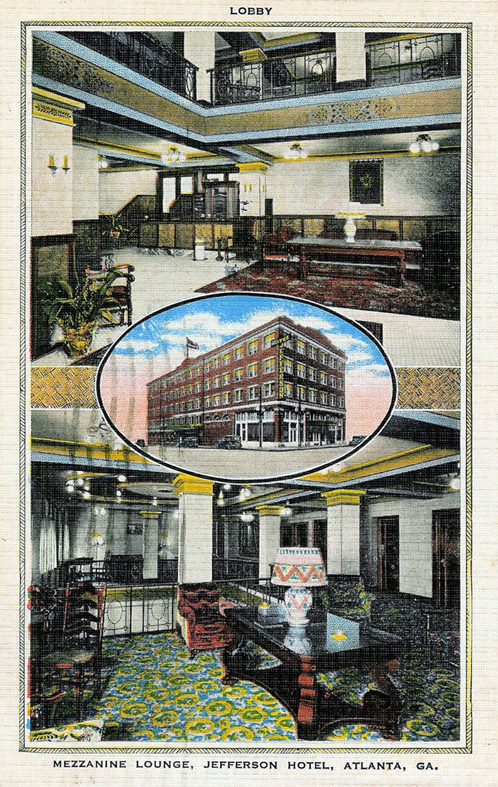 The Jefferson Hotel, built in 1921, was located at the intersection of Alabama and Pryor Streets (Google map). The building was designed by Emil Charles Seiz (1871 - 1940) who opened an Atlanta office in 1897. In 1980, the deserted building was badly damaged in an Underground Atlanta fire. More details can be found in this Associated Press article.