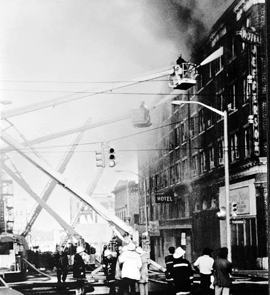 This photo, via Georgia's Virtual Vault, shows firefighters battling the blaze that destroyed the Jefferson Hotel in 1980. Incidentally, the GVV page mentions that the hotel was built in 1882, but that's unlikely if the commonly cited birth/death dates for architect Seiz (1871 - 1940) are accurate. The City Of Atlanta's web site lists the building's construction year as 1921.